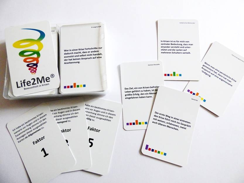 5. Der Kartensatz ‚Life2Me – Bewusstheit in Krisen‘ ermöglicht es Ihnen, in Ruhe auf Situationen zu schauen, die Sie als erhebliche psychische Belastung erleben würden, träten sie ein. Für die sieben Bewusstheitsebenen, die Graves erforscht hat und die mit den Farben Purpur – Rot – Blau – Orange – Grün – Gelb – Türkis benannt werden, haben wir jeweils 15 Aussagen formuliert, die diesen Ebenen entsprechen. Mit drei Gewichtungskarten können Sie entscheiden, inwieweit Sie der jeweiligen Aussage zustimmen würden, träfe ein Ereignis ein, das Sie vorab als potenzielle Krisensituation definiert haben. Aussagen, denen Sie gar nicht zustimmen, legen Sie beiseite, die restlichen zu den Karten mit den Gewichtungsfaktoren. Sind alle Karten zugeordnet, dann ermitteln Sie durch Multiplikation [Anzahl der Karten einer Farbe x Gewichtungsfaktor] die Gesamtstärke der sieben Bewusstheitsebenen im Kontext des Krisenszenarios.